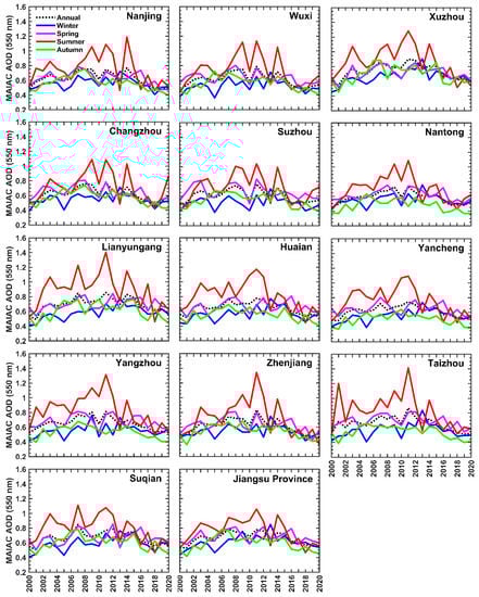 - The spatial distribution of annual mean AOD showed high values (over 0.60) in most cities, excluding the southeast of Nantong City, which was characterized by a low AOD value (<0.40). Moreover, the 21-year city-level annual mean AOD was highest in Xuzhou (0.73 ± 0.10) and lowest in Nantong (0.59 ± 0.08).