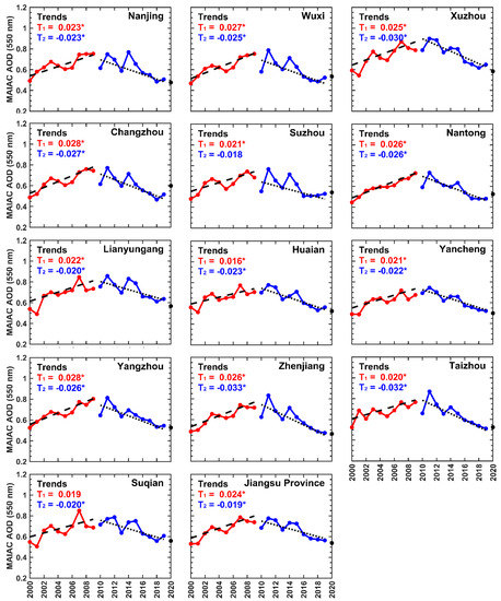 - Annually, significant upward AOD trends ranged from 0.016 to 0.028 (per year) in all the 13 cities during 2000–2009, being highest in Changzhou and Yangzhou and lowest in Huaian. Moreover, for 2010–2019, annually, significant downward AOD trends (per year) varied between 0.020 and 0.033, being highest in Zhenjiang and lowermost in Lianyungang and Suqian. These downward trends indicate the enhancement of air quality throughout the study area, perhaps because of implementing China’s strict air pollution control policies and proper control of vehicular emissions.