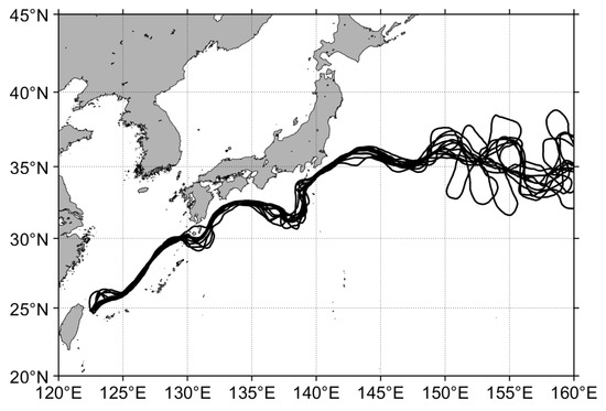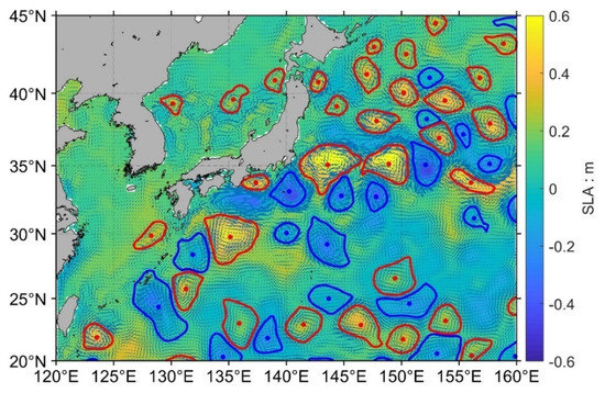As planned, the along-track SSH measurements from Sentinel-3, Haiyang-2 and other altimeters were fused to generate regular spatial-temporal SLA data, and these gridded data were used to detect mesoscale eddies [40] and to exploit geostrophic current for the ocean circulation study such as Kuroshio in the Pacific Ocean. Indeed, with the extensive used mean dynamic topography model named MDT_CNES_CLS18 [49], the geostrophic current data in 2018 are calculated according to the geostrophic equilibrium relation and absolute dynamic topography, which is the sum of SLA and mean dynamic topography. Then, characteristics of the Kuroshio main axis are extracted by identifying and tracking the maximums of ocean current. Results show that the Kuroshio can be divided into three sections, the East China Sea section, the southern section of Japan, and the eastern section of Japan. The main axis of the Kuroshio of the East China Sea section is stable, and the Kuroshio bends with monthly characteristics only in the northeast of Taiwan. The large meander of the Kuroshio in the southern Japan section can be detected clearly, and the monthly variations are obvious. The Kuroshio extends gradually, and the main axis swings chaotically in the eastern Japan section of the Kuroshio. The monthly variations are obvious (Figure 1). In addition, the mesoscale eddies in the western Pacific Ocean are detected by SLA grid data in 2017 (Figure 2). The results show that the mesoscale eddies are mainly distributed around the Kuroshio, and their movement is closely related to the Kuroshio. Within the framework of this research, primary analysis of oceanic mesoscale eddies observation abilities by Sentinel-3A SRAL has been published [40].