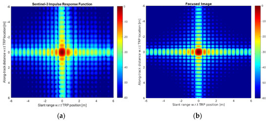 (a) The 2D-focussed Impulse Response Function (IRF) of a Fully-Focussed SAR (FF-SAR) processed Sentinel-3A real pass over Crete transponder on 14 June 2019. (b) A 2D-focussed IRF of an FF-SAR processed Sentinel-6 simulated pass-over transponder. The width of the main lobe on the across-track and along-track directions provides the estimates of the across-track and along-track resolutions, respectively.