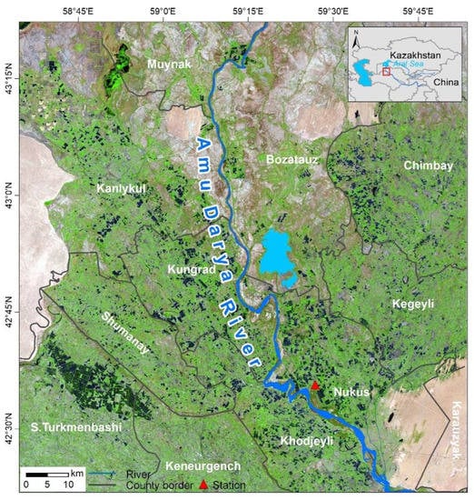 - Asarin, A.E.; Kravtsova, V.I.; Mikhailov, V.N. Amudarya and Syrdarya Rivers and Their Deltas. In The Aral Sea Environment; Kostianoy, A.G., Kosarev, A.N., Eds.; Springer: Berlin/Heidelberg, Germany, 2010; pp. 101–121. [Google Scholar]
