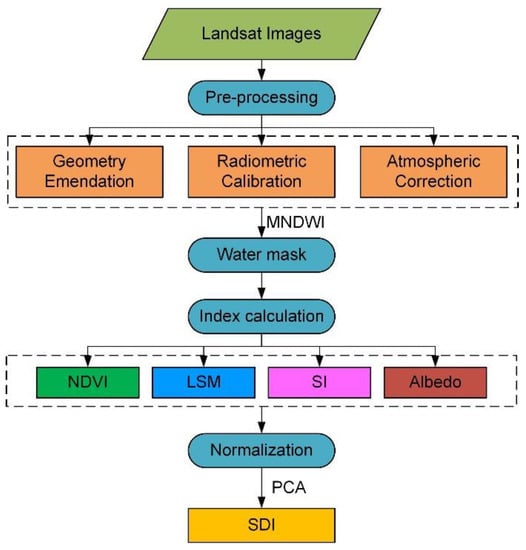 In this study, based on previous studies [,,], the PCA method was used to synthesize the four selected indicators (SI, albedo, NDVI and LSM) to construct the SDI. Before using the PCA method to couple the SDI for 1990, 2000, 2010 and 2019, respectively, it is necessary to normalise the four indicators in the range of 0 to 1 [] by Equation (6). The SDI obtained using Equation (7) and higher values of the SDI revealed more severe land degradation. Figure 2 illustrates the processing for SDI.