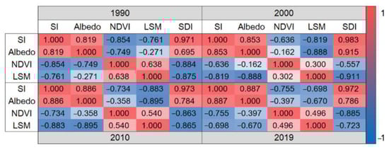 Furthermore, the correlation coefficient between each indicator and the SDI and that among the indicators are shown in Figure 3 (at the 0.01 level of significance). For four years, the SDI exhibited a high correlation with each single indicator. In general, the SDI exhibited a positive correlation with the SI and albedo and a negative correlation with the NDVI and LSM (Figure 3). The SI exhibited the highest correlation with the SDI, and the positive correlations were 0.971, 0.983, 0.973 and 0.972 in 1990, 2000, 2010 and 2019, respectively. The albedo exhibited the highest negative correlation with the SDI in 2000, and the correlation was 0.915. The NDVI exhibited the highest correlation with the SDI in 2019 (−0.885). The correlation coefficients between the LSM and SDI were greater than −0.72, and the highest correlation with the SDI was observed in 2000 (−0.911).