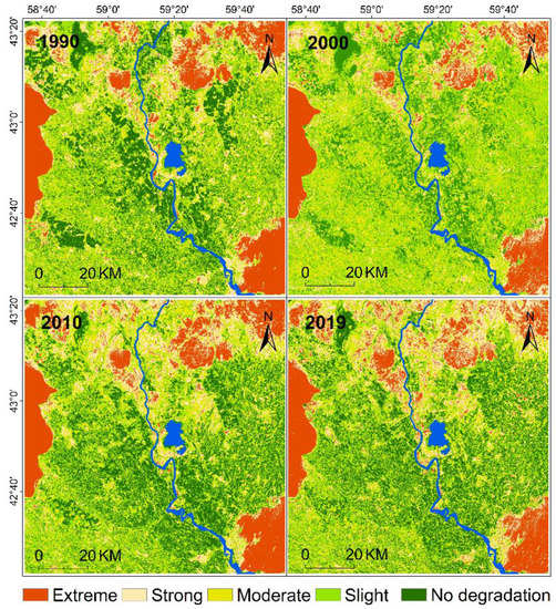 To analyse the spatiotemporal characteristics of the land degradation during the different periods in the ADD, the SDI values were normalised by Equation (6) (range of 0 to 1). As the SDI approximates a normal distribution, we divided it into five categories by equal intervals to indicate the different land degradation levels [,]—namely, no degradation (0–0.2), slight degradation (0.20–0.4), moderate degradation (0.4–0.6), strong degradation (0.6–0.8) and extreme degradation (0.8–1). In summary, the land degradation level distribution was not uniform in space and varied over space and time. As shown in Figure 4, in terms of the land degradation level distribution, the extreme and strong degradation areas were clustered in the west and north of the ADD during the studied years. Areas with moderate degradation corresponded to a sporadic distribution in the middle and south of the ADD. Most areas in the middle of the ADD exhibited a slight degradation. The spatial distribution of the not-degraded areas in the study area showed a difference in the 4 years: in 1990 and 2000, the not-degraded areas were mainly distributed along the Amu Darya River, and a small portion appeared in the northwest and northeast corners of the ADD; in contrast, the not-degraded areas were mainly distributed in the middle of the study area in 2010 and 2019 and formed a “V” shape.