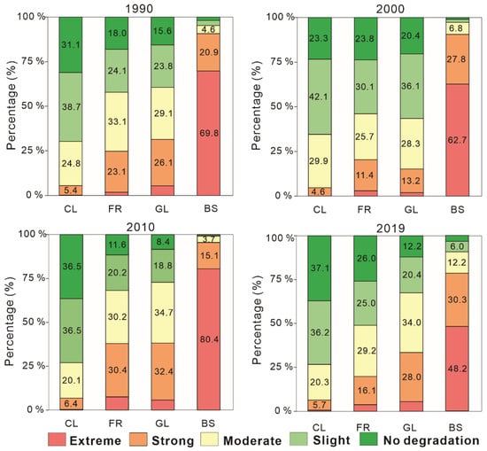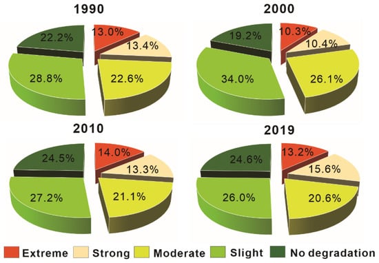 Figure 5 shows the percentage of the study area occupied by the five land degradation levels in 1990, 2000, 2010 and 2019. In general, the largest areas in the ADD were slight degradations in the years 1990–2019, which accounted for more than 26% of the total area covered by the Landsat images. From 1990 to 2000, the areas with extreme, strong and no degradation decreased, whereas the areas with slight and moderate degradations increased. From 2000 to 2010, the areas with extreme, strong and no degradation expanded; among which, the expansion of the no degradation regions was significant. In contrast, the areas with slight and moderate degradations exhibited a decreasing trend; in particular, for the areas with a slight degradation, the dynamic degree was 7%. From 2010 to 2019, a small increase from 13.30% to 15.56% of the total area was observed in the area with moderate degradation, and the areas of the other four levels did not change considerably.