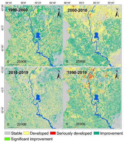 Overall, the stable areas accounted for a large proportion (more than 42%) during the four study periods (Table 3), and these areas were mainly located west and southeast of the ADD. From 1990 to 2000, the improvement areas covered 3653.78 km2 (30.6%), and these areas were mainly clustered north of the ADD (Figure 6). Additionally, the developed areas covered 2687.53 km2 (22.5%), and these areas mainly occupied the south and middle regions of the ADD. A smaller proportion (1.4%) of significant improvement areas was observed in the northern part of the ADD. In comparison, the proportion of the seriously developed areas was smaller (1.1%), and these areas were mainly located in the northwest corner of the ADD. From 2000 to 2010, the developed areas covered 3728.76 km2 (31.3%), and the areas were mainly concentrated in the northern part of the study area. The improvement areas covered 2886.02 km2 (24.2%) from 2000 to 2010 and were mainly located in the eastern and central parts of the ADD. The areas of seriously developed and significant improvement exhibited smaller proportions—0.92% and 0.88%, respectively—and the seriously developed areas were mainly observed downstream of the ADD. Compared with those in 2000–2010, during 2010–2019, the areas with developed, and the improvements exhibited decreasing trends and occupied 20.5% and 19.7% of the total area, respectively. Moreover, these regions were mainly clustered in the downstream of the ADD. The seriously developed and significant improvement areas occupied less than 0.4% of the total area. From 1990 to 2019, the developed areas covered 2901.65 km2 (24.3%) and were mainly concentrated north of the ADD and in the downstream region of the Amu Darya River. The improvement regions, which occupied 27.8% of the total area, were mainly observed in the west and east of the ADD. The seriously developed regions, with an area of approximately 217.75 km2, were mainly concentrated in the north of the ADD, and the areas with significant improvement were smaller, accounting for only 0.9% of the total area.