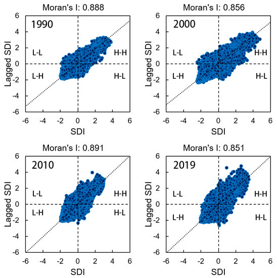 The mapping of the global spatial autocorrelation of the SDI is shown in Figure 7. Most of the SDI values are distributed in the first and third quadrants, with H–H and L–L clustered in the first and third quadrants, respectively, indicating a strong positive spatial correlation between the spatial units in these two quadrants. The Moran’s I values in 1990, 2000, 2010 and 2019 were 0.888, 0.856, 0.891 and 0.851, respectively, which were high values greater than zero. The results showed that the SDI of the ADD exhibited significant spatial clustering, which indicated a strong positive spatial correlation. The Moran’s I values of the SDI decreased, increased and later decreased again in 1990, 2000, 2010 and 2019, exhibiting an overall decreasing trend during the study period.