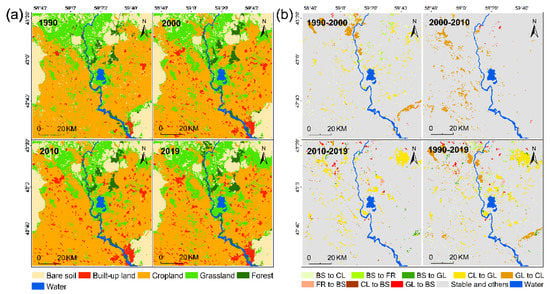 Land use change maps from 1990 to 2019. CL: cropland; GL: grassland; FR: forest; BS: bare soil. (a) land use maps for 1990, 2000, 2010 and 2019; (b) changes between different periods.