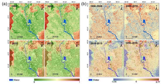 Amu Darya River is the main source of water for ADD living and irrigation. Overwatering has disrupted the water system of the ADD, leading to the disappearance of an amount of lakes, followed by local climate change, which has reduced the ecosystem stability of the ADD, particularly in the downstream region [,]. The widespread use of diffuse irrigation has caused individuals to compensate for inefficient irrigation by collecting large amounts of water, resulting in a reduction in the ecological water that sustains the ecosystems and the gradual withering of vegetation without sufficient water to support growth [,,], exacerbating the land degradation. The extent of the land degradation followed the same trend as that of the water withdrawal from Amu Darya River. With the decline in the water withdrawal in 1990–2000 (Figure 14), the improvement in ADD land degradation was most pronounced, while, in 2000–2019, as the water withdrawal increased, the land degradation developed in a larger area than the improvement area. A more critical situation is that the reservoir built in the upper reaches of the Amu Darya River intercepted a large amount of the water [], resulting in a decrease in the supply of ecological water downstream. The ecological effects caused by these factors were confirmed by our research: The land degradation downstream of the ADD was significantly degraded compared with the region in the study period (Figure 4 and Figure 6). In addition, the higher levels of land degradation in the outer delta, farther from Amu Darya River, were likely caused by the lack of water supply to the ecosystem and the difficulties in the land management in the transboundary area [,]. This finding indicates that, to alleviate the ADD land degradation and the ecological crisis in the Aral Sea basin, further effort and cooperation is necessary in the rational allocation of water resources.