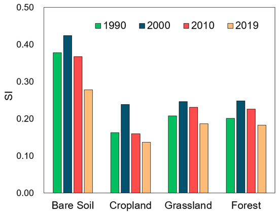 Figure 9 reveals the spatial distribution (Figure 9a) and variation (Figure 9b) of the SI over the study time period. The values of the SI were larger at the edges and north of the ADD and smaller in the centre. The SI in the northern part of the ADD decreased from 1990 to 2000, while it increased significantly from 2000 to 2010. From 2010 to 2019, the SI increased slightly in the central part of the ADD and decreased in the northeast. Throughout the study period (1990–2019), the SI increased significantly in the northern part of the ADD and decreased at the edges. To reveal the relationship between land use change and salinization, the mean SI values for each land use type (built-up land and water were excluded) were calculated in Figure 10. The mean value of the SI for the land use type was the largest in 2000 compared to the other three years, indicating higher soil salinization. The mean value of the SI for the land use type was the largest in 2000 compared to the other three years, indicating higher soil salinization, with a decreasing trend in the SI from 2000 to 2019. Within each year, bare soil had the largest mean value of the SI, followed by grassland and forest.