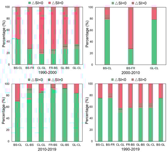 The dynamic characteristics of salinization during land use change were illustrated in Figure 11. The ΔSI represents the difference in the SI over the study period (the following year minus the previous year). We counted a percentage of areas with ΔSI < 0 and ΔSI < 0 over the course of each land use type transfer. The SI increased during all land use type changes from 1990 to 2000 (more than 50% of the area with ΔSI > 0), which was related to the maximum SI value in 2000 mentioned earlier. The 2000–2010 SI values decreased for BS-CL and GL-CL (ΔSI < 0 over 80% of the area). The area with ΔSI < 0 dominated the land use change process from 2010 to 2019. During the conversion of bare soil to cropland (BS-CL), forest (BS-FR) and grassland (BS-GL) from 1990 to 2019, the area with ΔSI < 0 exceeded 50%, indicating a decrease in the SI.