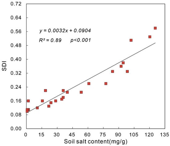 In this study, we established a new SDI by integrating the SI, albedo, NDVI and LSM indices based on the PCA method. The SDI was used to explore the land degradation characteristics for a typical salinized area, i.e., the ADD. We found that the regions with extreme land degradation were mainly distributed downstream and at the periphery of the ADD (Figure 4). The SDI-based results supported previous findings that the ecological risks and vulnerabilities are higher in the downstream and peripheral regions of the ADD [,], thereby demonstrating that the SDI can reflect the land degradation conditions of the ADD. To further evaluate the effectiveness of the proposed SDI, we evaluated its effectiveness by field survey data (Figure S1 and Table S1). The relationship between the SDI and soil salt content shown in Figure 12 indicates that the soil salt content was significantly positively correlated with the SDI (R2 = 0.89, p < 0.001). The relationships between the four indices derived from Landsat imagery in 2019 and field-measured soil salinity are also presented in Figure S2. There was a positive correlation between the SI, albedo and measured soil salinity (R2 = 0.41 and 0.43, respectively) and a negative correlation between the NDVI, LSM and measured soil salinity (R2 = 0.29 and 0.19, respectively). In contrast to the single indices, the SDI showed a stronger agreement with the measured soil salinity. In general, although the land degradation is influenced by multiple aspects of the environment, this positive correlation suggests that the SDI can capture the salinity features pertaining to the land degradation, which provides potential evidence for the effectiveness of the index in monitoring the land degradation in salinized areas. In addition, the SI extracted from the remote sensing data exhibits a positive correlation with the SDI (Figure 3). The reliability of the SDI is also reflected in the other three indicators. High vegetation cover and sufficient soil moisture reduce the risk of land degradation, and this finding is supported by the negative correlation between the SDI and NDVI and LSM in our study (Figure 3). An increase in the albedo values leads to a higher SDI, which is related to the exposure information represented by the albedo and may be attributed to a strong coupling between the soil salinity information and albedo (Table 1 and Figure 3). These characteristics have also been reported previously []. These results indicate that the SDI can help reliably and efficiently monitor the land degradation of salinized areas. In addition, the SDI is composed of accessible remote sensing indicators and can thus be extended to other similar ecological environments [,,].