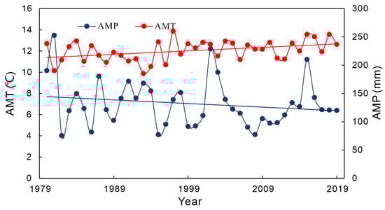 Climate variables mainly affect the land degradation through changes in the precipitation and temperature [,]. The annual mean precipitation (AMP) and annual mean temperature (AMT) of Nurkus Weather Station are shown in Figure 13. It can be noted that the AMP decreased and AMT increased in the ADD in the past 40 years. From 1990 to 2019, land degradation developed over an area of more than 3000 km2 (Table 3). Previous studies have raised concerns regarding the withering of grasslands and sparse vegetation caused by warming and dry climates in the ADD, warning that these aspects could accelerate land degradation [,].