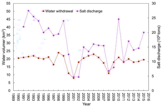 Annual changes in the water withdrawal and salt discharge in the ADD from 1990 to 2015.