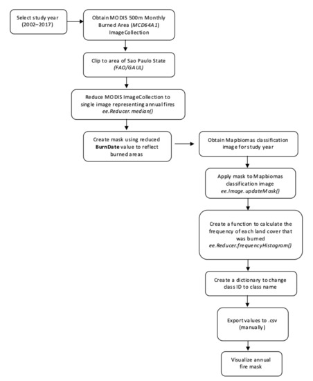 Figure 3 illustrates the complete methodological flow used to input and process the variables, create and apply the fire mask, and export data values. The full code used to calculate the number of burned pixels per classification category and to create the visualizations is available (see Supplementary Material, Figure S2).