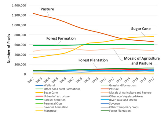 As the visual analysis suggests, the pixel analysis showed that both natural forest formation and forest plantation were not overly impacted by land transition. In fact, there was a very slight increase in coverage for both forest types over the study period. A much more dramatic change was observed in the transition of land use between pasture and sugarcane, which has an inverse relationship (Figure 5).