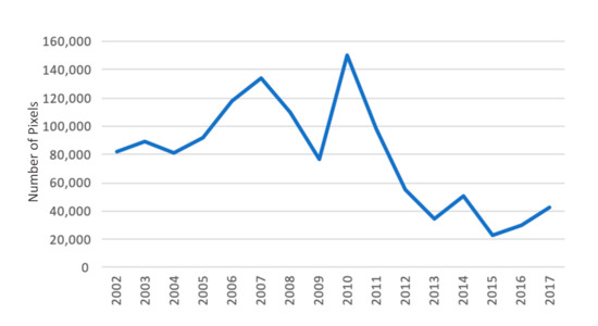 Using the MODIS data fire mask (Figure 6), the analysis showed that there was a total of over 426,000,500 m burned pixels representing fire events in SP between 2002 and 2017, corresponding to approximately 126,393,030 m burned pixels on the classification layers. Despite the numbers of fire events, the total percentage of burned land per year, based on pixel count, is low. The count of burned pixels represented 5% or less of all the pixels in SP. There appeared to be a steady upward trend in the number of fire events observed from 2002 to 2008 (3–4%), followed by a brief dip in 2009. The next year, 2010, showed the highest number of burned pixels across all years of the study period (5%). Each of the years since 2010 showed a decline in the number of burned pixels, although there was a small spike in the 2017 (Figure 7). Throughout the entire study period, on average 2.6% of the total land cover was burned, and after 2011, the burned area was consistently less than 2% of the total area of SP.
