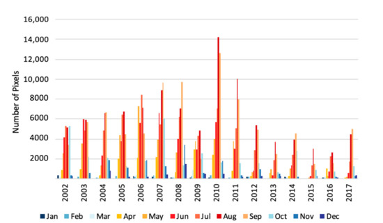 Another result of the analysis was the emergence of the pattern of seasonality (see Supplementary Material, Table S6). The analysis of the total count of annual MODIS burned pixels showed that there was generally a trend in which the frequency of fires tended to sharply increase in April, peak in August, and abruptly drop in October (Figure 9). This observed trend mirrors the documented sugarcane harvesting season in the São Paulo State [6,49,64,81]. The seasonal burn trend also demonstrates the general decline of fire events, excluding the spike in 2010.