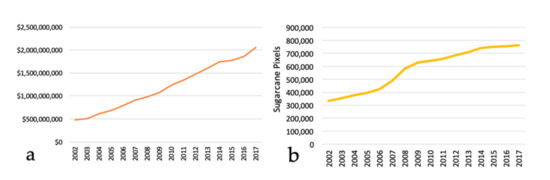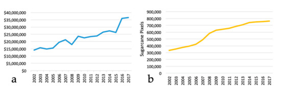 Studies have modeled the relationship between sugarcane expansion and per capita gross domestic product [50,51,52,53,54,55], however they do not reflect the last five to ten years of growth, nor do they consider how harvesting methods (e.g., use of fire) may relate to economic gain. In a few cases, studies determined that remotely sensed satellite images could be used to relate to economic development and production, however they often used the presence of nighttime light energy as a metric to represent the increased wealth of countries, and used Landsat images to detect those lights [56,57,58]. Additionally, studies that incorporate economic gain into analyses of LULC are often focused on precision agriculture, product optimization, and yield estimations [59,60,61].