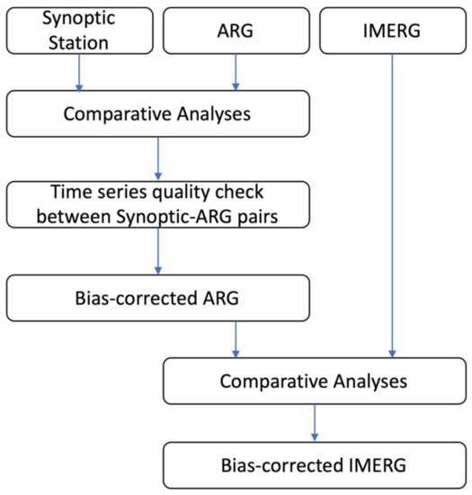 Process flow of comparative analyses performed using synoptic stations, ARGs, and IMERG data.