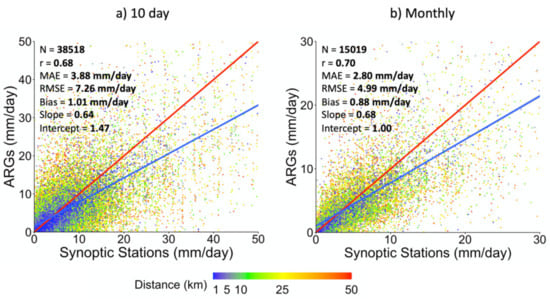 ARG rainfall measurements compared with synoptic station data using (a) 10 day and (b) monthly averages. The plots are color coded to indicate the distance between each ARG and the closest synoptic station.
