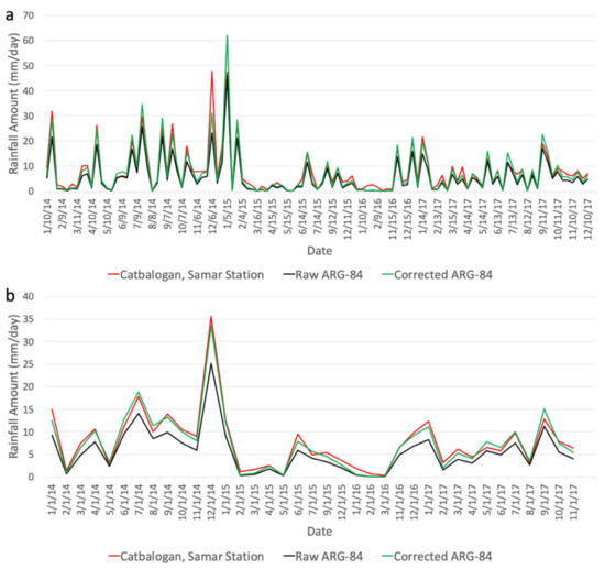 To further illustrate the value of making corrections on the ARG data, time series of 10 day and monthly rainfall are presented in Figure 7a,b, respectively. The plots show a comparison of raw ARG values, corrected ARG values, and synoptic station data in Catbalogan, Samar. It is apparent from the plots that the corrected ARG values, represented by the green line, are in a much better agreement with the synoptic data (in red) than the raw ARG data (in black). However, there are some disagreements with the synoptic data, which are sometimes higher than corrected ARG data, and vice-versa. This is expected because there are factors other than distances that may affect the difference in rainfall values. By comparison, the raw ARG data are shown to be consistently lower than the synoptic station data. Assuming that the differences between the synoptic data and raw ARG values are caused primarily by the same technical differences, including calibration, the same set of correction parameters was applied to all raw ARG data to generate an improved ARG dataset that is consistent with synoptic data.
