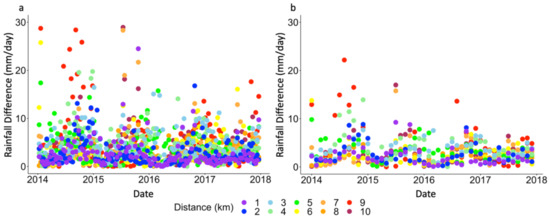 After performing bias correction for the ARGs, the absolute differences between rainfall measurements from ARGs and its nearest neighboring synoptic station were obtained per individual 10 day period and month. The absolute differences from all ARG–synoptic station pairs within specific distances were averaged, as shown in Figure 8. It can be observed that the discrepancy between the ARGs and synoptic stations decrease as their distance becomes closer. In this case, for distances of less than 1 km, the average discrepancy for both 10 day and monthly rainfall is usually less than 3 mm/day. It should also be noted that the discrepancies between ARGs and synoptic stations do not necessarily decrease monotonically with distances within the optimal range of 1 km because of the other factors indicated earlier. Moreover, there appears to be a seasonality in the differences, with peak rainfall discrepancies occurring during the Summer Monsoon months from June until September.