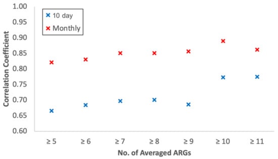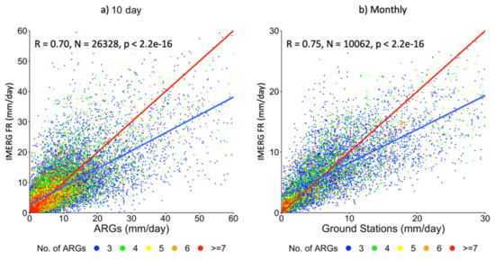 The number of ARG stations needed for an effective comparative study of IMERG FR data and ARG data depends on various factors, including the uniformity of rain over a large area. To assess the optimal number, correlation coefficients as a function of the minimum number of ARGs within the satellite footprint are plotted in Figure 13. It is apparent that the correlation coefficient increases with the minimum number of ARGs. The plot for monthly data shows a slight increase in the correlation coefficients from 0.83 for ≥5 ARGs to about 0.89 for ≥10 ARGs. The plot for 10 day data shows a greater increase from 0.67 for ≥5 ARGs to about 0.77 for ≥10 ARGs. It appears that the use of 10 ARGs in the aforementioned analysis is desirable and, although using more would be preferred, the results at ≥11 ARGs indicate declines in correlation coefficients, suggesting statistical limits due to the relatively small number of ARG measurements that meet this criterion.