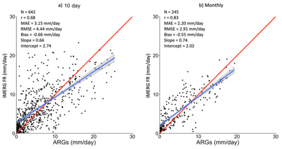 Scatter plots of raw IMERG FR versus averages of corrected ARGs within the IMERG FR footprints are presented in Figure 10a,b for 10 day and monthly data, respectively. Only pixels with a minimum of 10 ARGs within its footprint are presented, and linear regression analysis yielded a correlation coefficient of 0.68 for the 10 day and 0.83 for the monthly data. In addition, rainfall biases were −0.66 mm/day and −0.55 mm/day for 10 day and monthly rainfall. Negative biases indicate that average residuals point to higher IMERG FR rainfall estimates. However, the slope values of less than one indicate a linear trend in which ARGs are greater than IMERG FR rainfall estimates. Similar comparisons were also performed using IMERG LR and the results were similar to those from the use of IMERG FR.