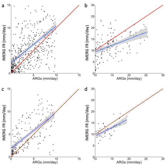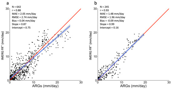 To better understand the relationship of IMERG FR and ARGs, as depicted in Figure 10, data during light to moderate rain days (0.1 to 10.0 mm/day) were plotted separately from those during heavy to severe rain days (10.0 to 30.0 mm/day). As shown in Figure 11, IMERG FR tends to overestimate ARG rainfall during light to moderate rain days, which is depicted by the majority of the scattered points lying above the perfect agreement (red) line. The opposite can be observed during heavy to severe rain days, in which IMERG FR usually underestimates ARG rainfall. Because the slopes are different, these discrepancies per rainfall interval can be further used to optimize the accuracy of the bias correction technique that will be employed to IMERG FR.