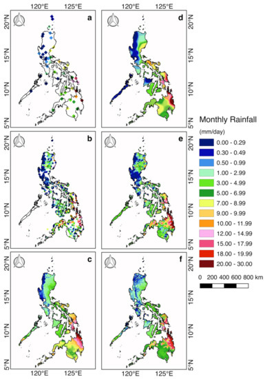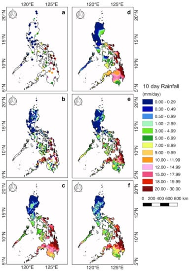If satellite data is not available, the only means of obtaining regional patterns is through spatial interpolation of the synoptic and ARG data. Spatial interpolation was undertaken by applying inverse distance weighting [24] with the power parameter, p = 5 on synoptic and ARG rainfall data, as illustrated in Figure 14d,e, respectively. These two images show generally similar patterns but there are distinct differences in some regions. For example, the patterns in the southern island of Mindanao and of the island of Palawan are quite different. Spatially interpolated ARGs were used as a basis for the ARG threshold values required for the two-step bias correction of the IMERG FR product shown in Figure 14f. However, interpolated synoptic stations may also be used when ARGs are not available because similar spatial patterns are observed between the two. When the bias-corrected IMERG FR is compared with the raw IMERG FR data shown in Figure 14c, distinct differences are observed, highlighting the significant improvements in the IMERG FR product. However, when compared with the spatially interpolated synoptic and ARG data, huge differences are apparent, especially in areas where there is a paucity of measurements, or no measurements, from the ground. These results show the weakness of having just ground observations as provided by the synoptic and ARG data.