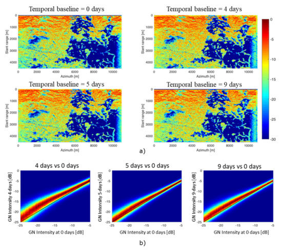 The evaluation of the impact of temporal decorrelation on AGB retrieval based on interferometric data was carried out with reference to the ground-cancellation technique introduced in References [,]. The technique consists in a coherent combination of two or three SAR images that allows to cancel out the ground echo and emphasize canopy backscattering, and it is currently assumed as the baseline retrieval approach for BIOMASS []. Our analysis consisted of implementing the ground-cancellation technique, using airborne campaign data acquired on the same day and on different days (time lags of 4, 5, and 9 days). In doing so, we were able to provide a direct measurement of the radiometric error due to temporal decorrelation [].