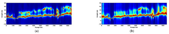 Temporal effects were studied on an experimental basis, using data from the ground-based campaign TropiSCAT and from the two airborne campaigns BioSAR 1 and AfriSAR [,,]. TropiSCAT data were used to directly mimic BIOMASS acquisitions by analyzing tomograms formed by taking the signals acquired by different antennas on different days. Since BIOMASS tomography is implemented by taking acquisitions, each separated by three days, we considered tomograms obtained by taking two TropiSCAT antennas every 3 days (and three antennas on the last day), which means that any single tomogram can be obtained by mixing seven different days. As in Reference [], we hereafter refer to these tomograms as “7-day tomograms”. Each 7-day tomogram is associated with an “instantaneous tomogram” obtained by taking all 15 antennas at 6:00 a.m. on the seventh day, which is used as reference. Tomographic processing is then carried out by focusing the acquisitions from seven days in ground range-height coordinates by time-domain back projection. As a result, it was possible to form 66 7-day tomograms, of which 61 included acquisitions with both sunny and rainy days, so as to provide a clear experimental assessment of the radiometric error due to changing weather conditions. The error was then translated to an AGB retrieval error based on the observed sensitivity of tomographic data to forest biomass at the TropiSCAT site, which was known from airborne measurements [].