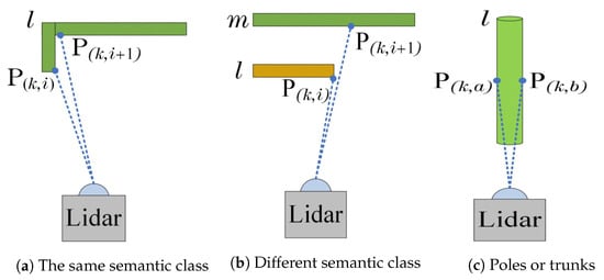Different from LOAM, the proposed method works in the point cluster with the same semantic label line-by-line according to the chronological order. Let be the ith point of the kth point cloud acquired during the sweep k, . Note that the superscript l indicates the semantic label of point . Point is selected as an edge point only if one of the following three cases is satisfied.