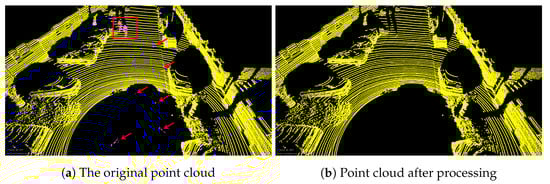 Removing dynamic objects and outliers in the point cloud, which is from a certain point cloud of sequence 00. (a) Point cloud with dynamic objects. The pink part indicates dynamic objects, i.e., bicyclist, which is marked by the red rectangle and outliers (marked by red arrows). (b) Point cloud after removing bicyclists and outliers.