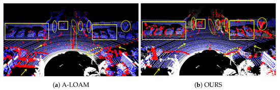 In addition to the above, A-LOAM also mistakenly extracts some points as edge points. For example, red points marked by dotted yellow rectangles in Figure 5a. These points are from the junction of the starting and ending positions of a LiDAR scan circle. Due to the influence of motion deformation, there is a large distance between points at the starting position and the ending position, and the extraction method that uses the distance to calculate the smoothness will mistake them as edge points. As a result, these points are always extracted as edge points when the LiDAR moves forward. Further, some outliers are extracted as edge features in A-LOAM, as shown in Figure 5a (marked by yellow arrows). By contrast, our semantic label-based method completely removes these false edge extractions. As for planar features, our method and A-LOAM show similar performances in Figure 5. However, we only extract planar features from objects with plane attributes, such as roads, sidewalks, buildings, traffic-signs and cars. This greatly increases the accuracy of planar feature extraction.