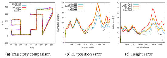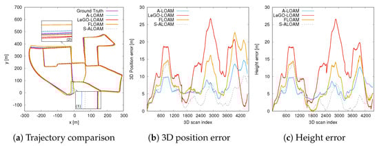 Figure 6 shows the trajectory comparison graph of the sequence 00, which is collected in urban. As Figure 6a shows, the proposed approach, S-ALOAM, generates more consistent trajectories than other methods. This shows semantic labels-based feature extraction does improve the performance. However, compared with LeGO-LOAM, the other three methods suffer accumulation errors in loop closures. As Figure 6a(1),a(2) show, there are large gaps when the robot revisits the same place. By contrast, LeGO-LOAM performs better in loop closures. This is because loop closure constraints of LeGO-LOAM correct the accumulated drift. Meanwhile, Figure 6b,c show similar error curves, which demonstrates the position error is mainly caused by height errors in LOAM and its variants.