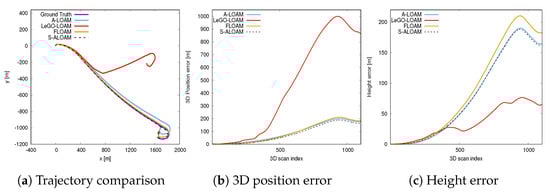 In addition, we found that height estimation is one of main error sources in the LOAM algorithm and its variants. This is especially obvious in sequence 00 and sequence 01. For example, we can see from Figure 8a that the 2D trajectory of S-ALOAM coincides well with the ground truth. Meanwhile, Figure 8b,c show similar error curves. These demonstrate the height error accounts for a large proportion in the total absolute translation error. The main factors that cause a large height error is uneven ground. This is because the planar features provide necessary constraints for height estimation, and slopes in the environment may cause height estimation errors. If these small local errors are not corrected, they will continue to accumulate and eventually cause large height errors.