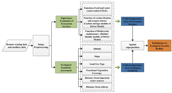 According to “Ecological Redline Delimitation Guide” issued by the general office of the Ministry of environmental protection of China, the importance of ecosystem service function and ecological sensitivity of study areas were evaluated. According to the references [21,22] and the characteristics of ecological environment in study areas, three indicators were selected for evaluating the importance of ecosystem services and six factors for the ecological sensitivity (Table 2). The flow chart of ecological protection redline delimitation is shown in Figure 2.