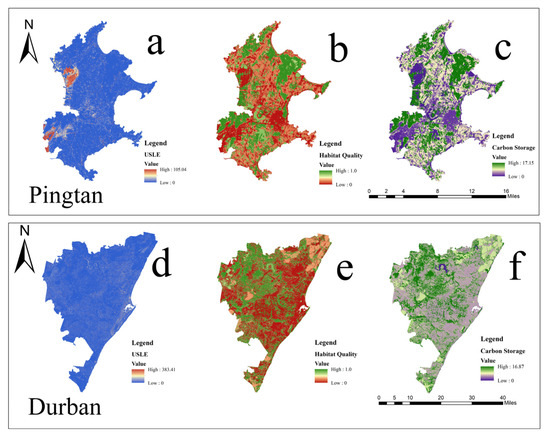 According to the method mentioned in Section 2.2.1, the soil erosion, habitat quality and carbon storage of Pingtan and Durban were calculated, respectively. The results are shown in the Figure 3. It can be seen from the Figure 3a,d that Pingtan is more seriously eroded in the western coastal area, while Durban is more seriously eroded in the southeast coastal area, which is greatly disturbed by human activities. Figure 3b,e shows that in Pingtan and Durban forest land and grassland had better habitat quality, they are the important parts to maintain the stability of ecosystem. Figure 3c,f shows that the carbon storage of Pingtan and Durban is higher in the area where forest land is concentrated. The value of carbon fixation and oxygen release of forest is the basis of life support of the earth.