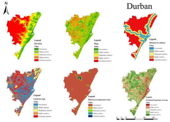 The main data used in this paper are shown in Table 1, including Landsat 8 oli image data of Pingtan (imaging time: 2 April 2017) and DEM data, with a spatial resolution of 30 m (from geospatial data cloud: http://www.gscloud.cn/ (accessed on 25 January 2021)). Pingtan soil data, with a spatial resolution of 30 m (from Nanjing Soil Research Institute: http://www.issas.ac.cn/ (accessed on 7 March 2021)). Pingtan basic geographic information data (from the China Geographic Information Resources Directory Service System: https://www.webmap.cn/ (accessed on 27 January 2021)) and Pingtan administrative division data. Zhuhai-1 satellite image data (imaging time: 16 March 2020; Spatial resolution: 10 m). Landsat 8 oli image data of Durban (imaging time: 3 June 2017) and DEM data, with a spatial resolution of 30 m (from the United States Geological Survey (USGS): (https://earthexplorer.usgs.gov/ (accessed on 18 April 2021)). Soil data of Durban, with a spatial resolution of 1 km (from Harmonized World Soil Database: http://www.fao.org/ (accessed on 18 April 2021)). The acquired soil data were drawn manually, and the resolution was converted to 30 m. Basic geographic information data (from the open street map: (http://openstreetmap.org/ (accessed on 20 April 2021))) and the data of administrative divisions in Durban. Landsat 8 oli image data was used for land use classification and vegetation coverage calculation after remote sensing image preprocessing. According to the actual situation of Pingtan Island and Durban, the land use types were divided into six categories: Agriculture, Forest land, Build-up land, Grassland, Water body and Undeveloped land. The random forest classifier was used for classification. After testing, the overall classification accuracy is more than 88%, which meets the research needs. DEM was used to extract elevation and slope. Basic geographic information data was used to extract road and railway networks. Zhuhai-1 satellite image data was used to calculate the red-edge vegetation index.