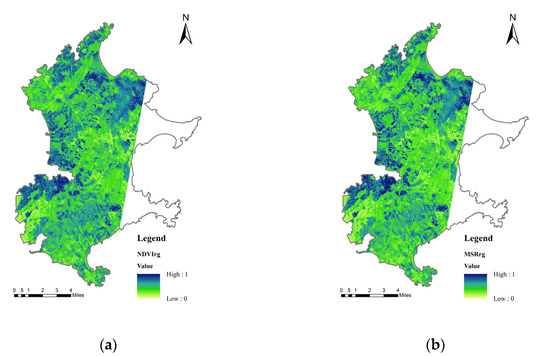 In order to further evaluate the ecological security status of Pingtan, the hyperspectral satellite image of Zhuhai-1 was used to calculate four red-edge vegetation indices. The red-edge vegetation indices were normalized, and the results are shown in Figure 13. The Zhuhai-1 satellite images used in the study did not cover the whole study area. The mean values of vegetation indices of different land-use types were taken in the study, which approximately represented the mean values of all classes in the whole study area. Based on the classification results and the calculation results of vegetation index, the mean values of red-edge vegetation index of different land types were calculated, as shown in Table 12. It can be seen from Table 12 that the average value of four vegetation indices of forest land in Pingtan is the highest, while the average value of build-up land is the lowest. The order of Red-edge Normalized Difference Vegetation Index (NDVIred-edge) and Red-edge Simple Ratio Index (MSRred-edge) was forest > water > grassland > agriculture > undeveloped land > build-up land. The order of Chlorophyll Red-edge Index (CIred-edge) and novel Inverted Red-edge Chlorophyll Index (IRECI) was forest > grassland > water > agriculture > undeveloped land > build-up land.