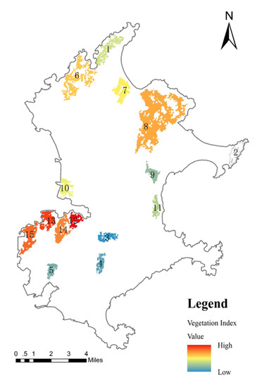 Based on the results of ecological sources extraction and vegetation index, the average values of four red-edge vegetation indices in different ecological source areas were counted. The average values of the four vegetation indices were superimposed with equal weight to obtain the comprehensive vegetation index (VIS). Since the hyperspectral image does not cover the whole study area, the mean value of 14 source patches except source 2 is calculated, as shown in Table 13. The statistical results of the comprehensive vegetation index were visualized, as shown in Figure 14. It can be seen from Table 13 that source 12 is the ecological source patch with the highest mean value of comprehensive vegetation index, source 3 is the lowest. Source 12, 13 and 15 are the ecological source patches with higher vegetation index, while source 3, 4 and 5 are the ecological source patches with lower vegetation index. The vegetation index can reflect the growth and health status of plants. As an important component of the ecosystem, vegetation not only provides habitat and food sources for animals but also plays a role in regulating the balance of carbon and oxygen. Therefore, the ecological source areas with better growth and health status of vegetation play a more critical role in the ecological security pattern.