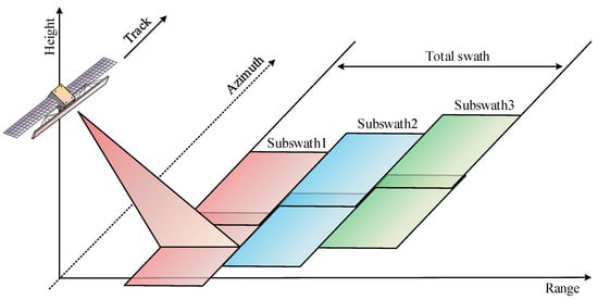As an important technology based on stripmap SAR, ScanSAR has been applied in many spaceborne SAR systems. Figure 1 shows the working mechanism of spaceborne ScanSAR. Unlike the fixed antenna pointing of stripmap SAR, ScanSAR can obtain several times the range swath of stripmap SAR by switching radar beams within a preset angle range. The antenna scans from different subswaths in turn.