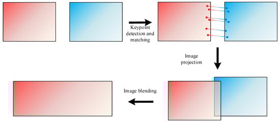 where and stand for the scaling degree of rows and columns, respectively, and reflect the rotation of the image rows and columns, respectively, and and represent the translation of rows and columns, respectively. The homography matrix, which directly affects the accuracy of image projection, should be filtered by the RANSAC algorithm because using mismatched keypoints for the calculation is possible [,]. Four pairs of matched keypoints were selected randomly to calculate a homography matrix. Then, all matched keypoints were projected based on the homography matrix, and their Euclidean distances between coordinates (threshold) were recorded. The number of the correctly matched keypoints, whose threshold was less than one, were also recorded. After iterating the above steps multiple times, the accurate homography matrix with the most correctly matched keypoints could be screened. The threshold was one pixel in this paper. The number of iterations was 2000. Such parameters of the RANSAC algorithm can result in a higher accuracy of homography matrix calculation and were independent from the images to be stitched. In addition, the RANSAC algorithm used in this paper was very efficient and took time in seconds.