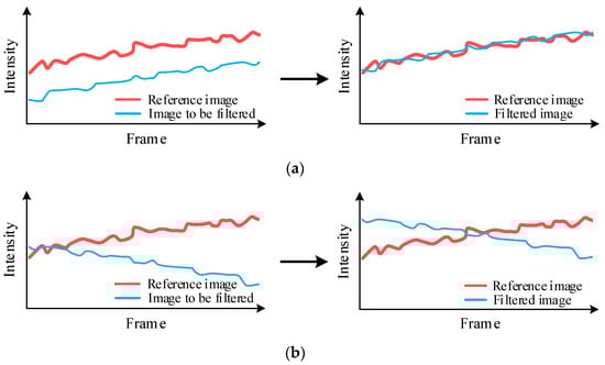 The intensity distribution trends along the stitching seam of two images before and after classic Wallis filtering. (a) The situation of similar trends; (b) the situation of opposite trends.