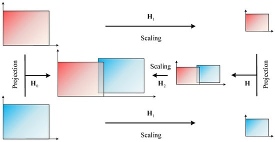 To ensure the accuracy of projection, the scaling compensation for the homography matrix should be precisely deduced. As shown in Figure 5, the rows and columns of the reference image and the projected image were scaled to . The homography matrix used to complete this step is as follows: