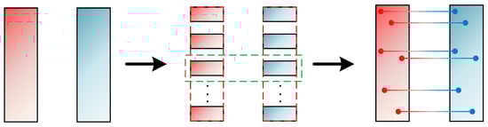 Directly calculating the homography matrix using the matched keypoints obtained from the downsampled divided overlapping areas was not enough. It should be noted that to ensure the accuracy of H0 and the mosaic relationship between block and block, the coordinates of the matched keypoints must be corrected due to the offsets caused by overlapping area extraction, downsampling and division. Taking transverse stitching as an example, the row coordinate offset of the overlapping area’s kth part in is: