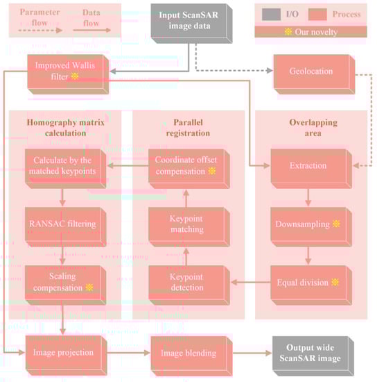 In summary, the new method is a combination of the traditional process and our novel improvements. Figure 7 shows its entire workflow: (1) inputting the image data of spaceborne ScanSAR; (2) geolocation; (3) image preprocessing by the improved Wallis filter; (4) overlapping area coarse extraction based on the longitude and latitude of the pixels; (5) overlapping area downsampling, (6) equal division of the downsampled overlapping areas; (7) keypoint detection by the SIFT algorithm, keypoint matching and coordinate offset compensation of matched keypoints (all run in parallel); (8) homography matrix calculation, RANSAC filtering and scaling compensation; (9) preprocessed image (in original size) projection based on the compensated homography matrix; (10) image blending by the weighted-average algorithm; (11) outputting the smooth, seamless and large-area image of spaceborne ScanSAR.