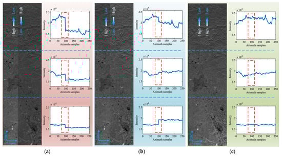 To verify the effect of the improved Wallis filter, the mosaic results without preprocessing, using the classic Wallis filter and using the improved Wallis filter, were compared in this paper. Two ScanSAR images of GF-3, which corrected the intrinsic periodic scalloping in the azimuth and the effect of the roll angle error on the range, were selected to implement this experiment. We divided every stitching result into three parts for comparison. As shown in Figure 8a, the intensity of the original images was not consistent. There was an obvious stitching seam due to the fault in the azimuthal intensity distribution (the azimuth is along the vertical direction in this image). The result using the classic Wallis filter is presented in Figure 8b, where the seam still exists even if the intensity distribution in azimuth of the middle part is balanced. Therefore, the limitation of the classic Wallis filter is that it had difficulty handling the situation where the means and standard deviations were very similar but the trends in the intensity along the seam were opposites. Figure 8c provides the result based on the improved Wallis filter. The azimuthal intensity of all three parts is consistent, and the connection between the two images is smooth, which means that the mosaic seam was successfully eliminated. In addition, for two images with the same trends in the intensity along the seam, both the classic Wallis filter and the improved Wallis filter could achieve good results. Therefore, the effect of the mosaic results can be markedly improved by the improved Wallis filter, which is more robust than the classic filter.